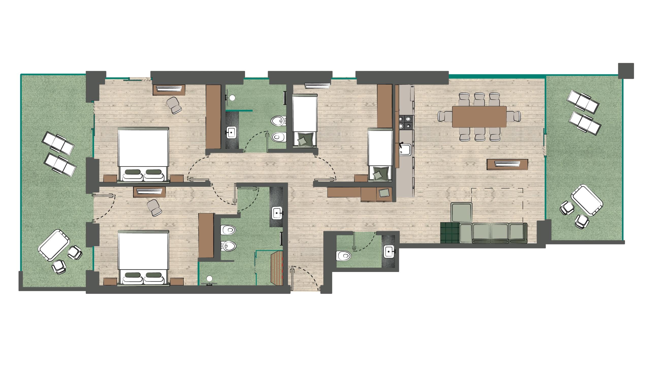 - Ogni appartamento è dotato di un divano letto di qualità, dove possono dormire comodamente due ospiti in più, sia adulti che bambini. In questo caso si applica un supplemento, salvo per i bambini al di sotto dei 3 anni che pernottano comunque gratis.