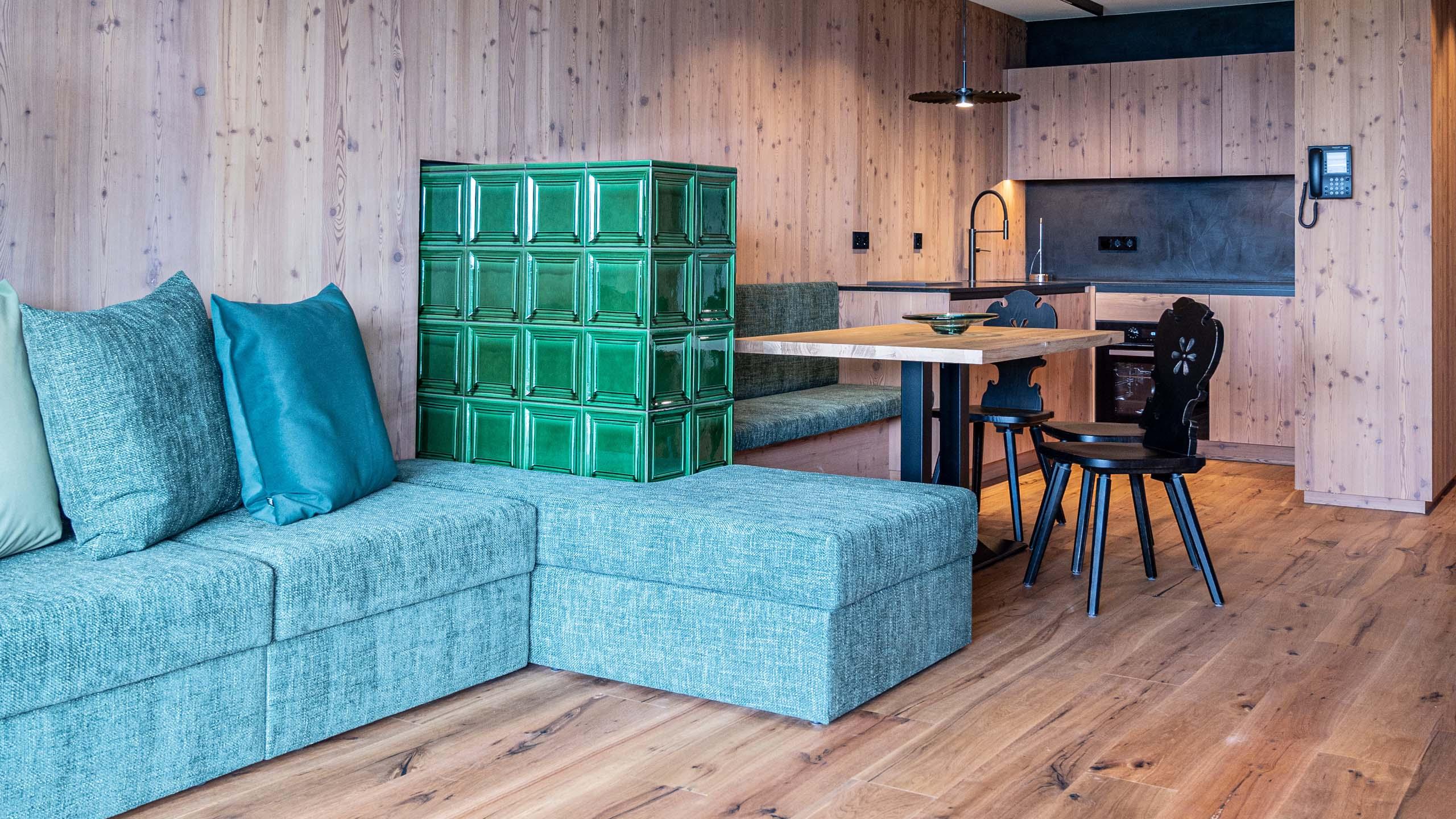 - Ampia zona giorno con cucina, tavolo da pranzo, stufa in maiolica, TV SAT e divano letto