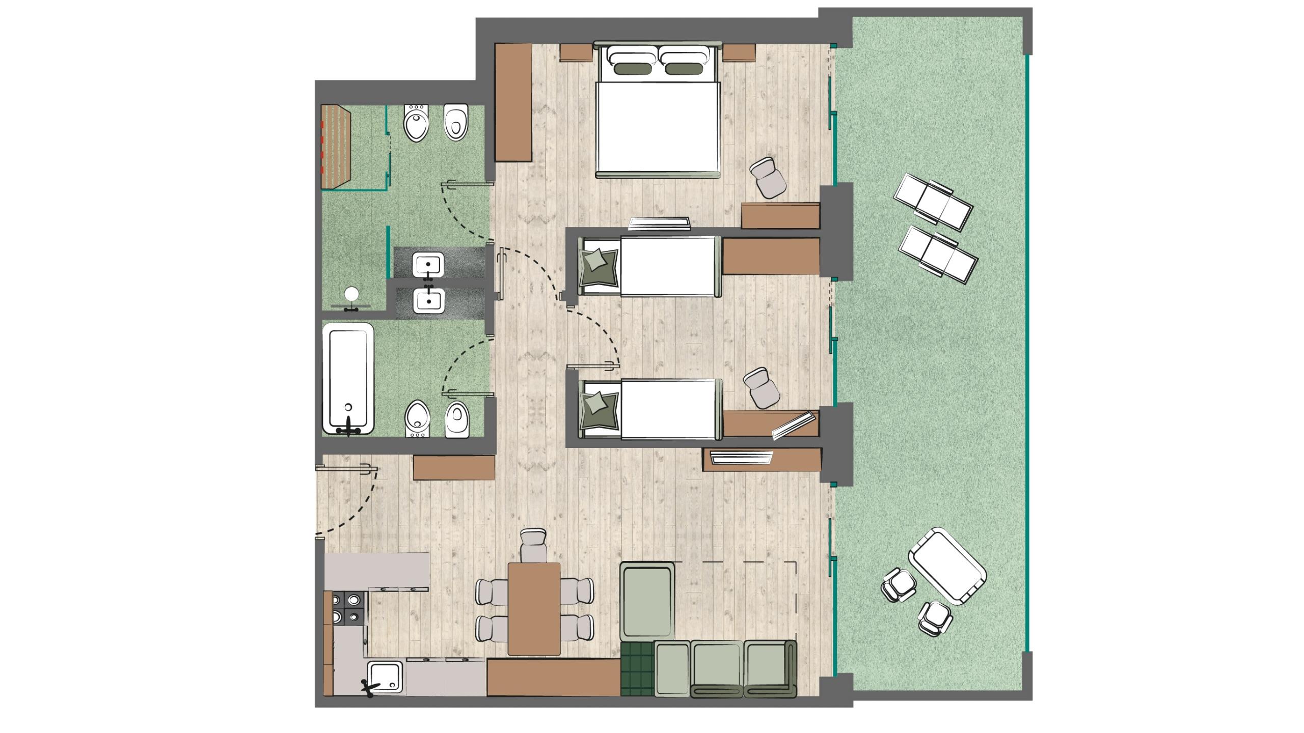 - Ogni appartamento è dotato di un divano letto di qualità, dove possono dormire comodamente due ospiti in più, sia adulti che bambini. In questo caso si applica un supplemento, salvo per i bambini al di sotto dei 3 anni che pernottano comunque gratis.